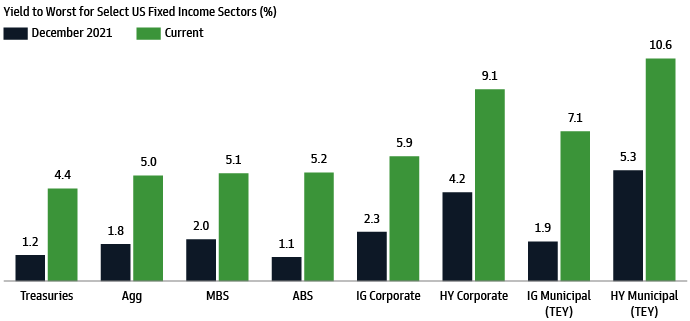 Source: Bloomberg and Goldman Sachs Asset Management. As of October 31, 2022. “Treasuries” refer to the US Treasury component the Bloomberg US Aggregate Bond Index. “Agg” refers to the Bloomberg US Aggregate Bond Index. “MBS” refers to the Mortgage-Backed Securities component of the Bloomberg US Aggregate Bond Index. “ABS” refers to the Asset-Backed Securities component of the Bloomberg US Aggregate Bond Index. “IG Corporate” refers to the Bloomberg US Corporate Investment Grade Index. “HY Corporate” refers to the Bloomberg US High Yield Corporate Index. “IG Municipal” refers to the Bloomberg Municipal Bond Index. “HY Municipal” refers to the Bloomberg Municipal High Yield Index. “TEY” refers to tax-equivalent yield for municipal bonds. “Tax-equivalent yield” refers to yield divided by one minus the current tax rate. A 40.8% tax rate is used to calculate tax-equivalent yield for current period. Goldman Sachs does not provide accounting, tax, or legal advice. Please see additional disclosures at the end of this document.