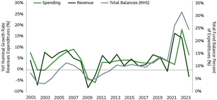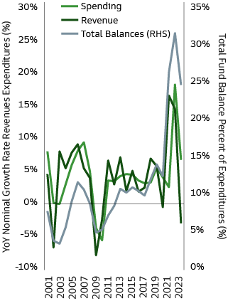 The good news is that, unlike leading up to the Great Recession, governments are sitting on a record war chest of liquidity, with rainy day funds hitting all-time highs in 37 states by the end of the 2022 fiscal year. Robust economic expansion in the last decade alongside enhanced federal aid during the depths of COVID-19, have resulted in reserve levels that the industry has never experienced, equal to about 30% of spending (Exhibit 2, grey line).