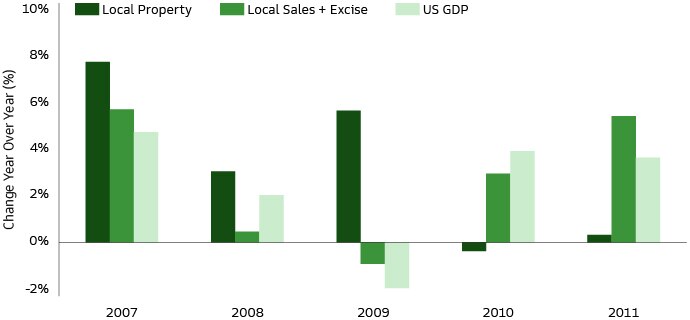 Making up nearly 40% of annual revenues on average, property taxes play a critical role in local government finance and tend to act as a stabilizing revenue source for municipalities during periods of fiscal stress. Property tax revenues generated in a particular fiscal year are based off valuations calculated one or two years prior to that budget cycle. This in effect, provides municipalities the luxury of weathering the fiscal storm created by near-term declines in more economically sensitive revenue streams such as income and sales taxes. In fact, it’s not uncommon for property taxes to increase during the first years of a recession while other revenues fall and then reverse the pattern during recovery (Exhibit 1). Consequently, the timing lag affords municipal management teams the flexibility to downwardly adjust expense budgets and/or potentially increase tax rates to offset upcoming tax base declines, provided the political will exists to do so.