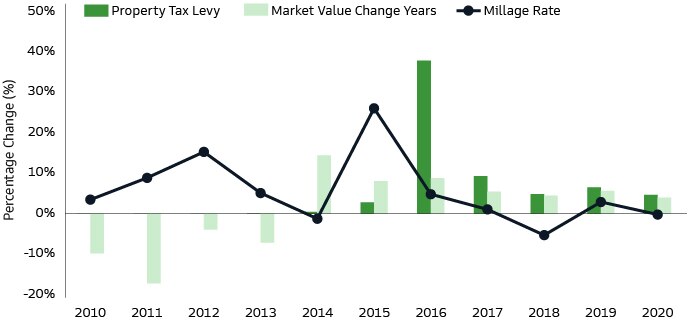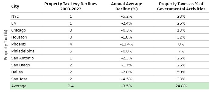 The relative stability of property tax revenues becomes more apparent when examining city-specific data. The top 10 most populous cities in the US saw their property tax levies decline, on average, just over 2 times over the 20-year period from 2003-2022. Furthermore, the severity of those declines was just -3.5% on average with only one city (Phoenix, -13.4%) experiencing double-digit average declines. As an aside, it’s worth noting that property taxes only accounted for 8% of Phoenix’s governmental activity revenues in fiscal year 2022.