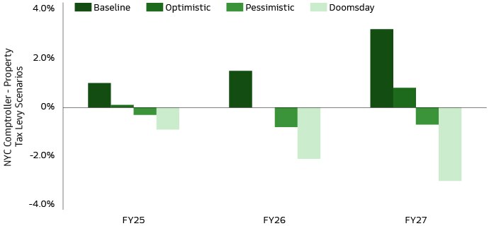The impact that remote work arrangements has had on commercial real estate, particularly office buildings, has garnered significant headlines post-pandemic. While many office building appraisals have come under pressure as of late, we do not expect valuation declines to have a materially negative impact on property tax revenues or the fiscal health of municipalities. While property tax revenues generally make up the single largest revenue stream for local governments, municipal taxbases tend to be dominated by residential, not commercial property. Interestingly, the direct impact of office-generated property taxes tend to be relatively muted in some of the most business concentrated cities. Case in point, office buildings account for 18% and 21% of San Francisco and New York City tax bases, respectively. Given that property taxes make up roughly 28% of San Francisco’s total revenues and 25% of New York City’s, only ~5% of each city’s revenues are directly generated from office properties. In fact, the New York City Comptroller recently released a “doomsday” scenario for the Manhattan office market which concluded that a decline of -40% in the market value of office properties from pre-pandemic levels would result in a drop of just 3% of the city’s property tax levy in fiscal year 2027.