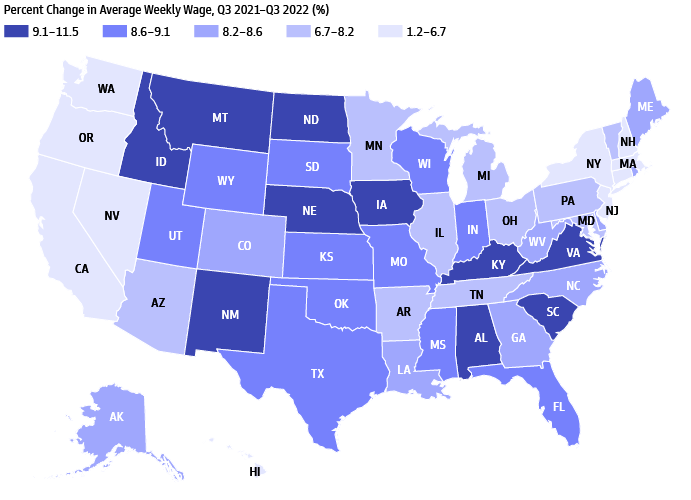 As might be expected, the labor shortfall is also uneven across sectors and regions. For example, the secular trends of de-globalization and the re-shoring of supply chains have added job openings in manufacturing, whereas the supply of domestic manufacturing workers still has a long way to go to catch up. Since 2009, the job opening rate in the US manufacturing sector grew significantly and peaked at 7.4% in April 2022, compared to a range of roughly 1% to 3% between 2001 and 2008. For the time being, inland states that have higher dependence on industrial sectors, including manufacturing, appear to experience more severe labor shortages. For example, states on the two coasts, including New York and California, are more services-oriented, and labor shortages have not been a pressing problem. In these states, wage growth is already falling behind inflation by a considerable margin. The impact of monetary tightening and aggregate demand cooling will continue to be felt across the country. In relative terms, the coasts may be more vulnerable. However, further loosening of labor markets on the coasts would not lead directly to a replenishment of labor supply in the middle of the country. Fiscal and governmental programs may be better positioned to solve the mismatch between labor supply and demand while making targeted progress toward disinflation. The fundamental cure for these problems may come from immigration, digitalization, and technological advancements.