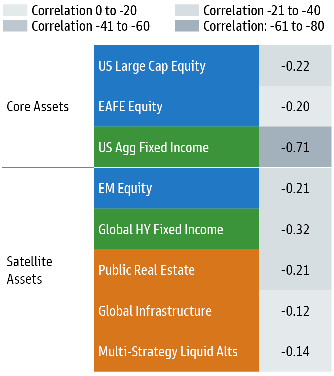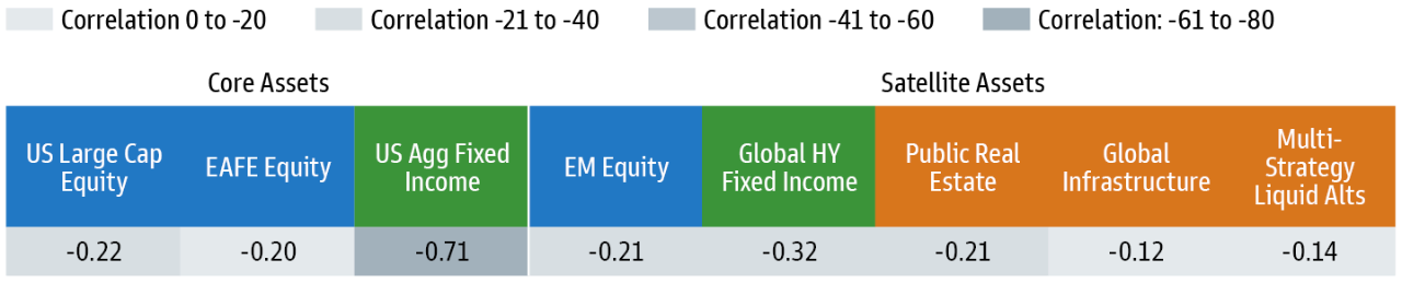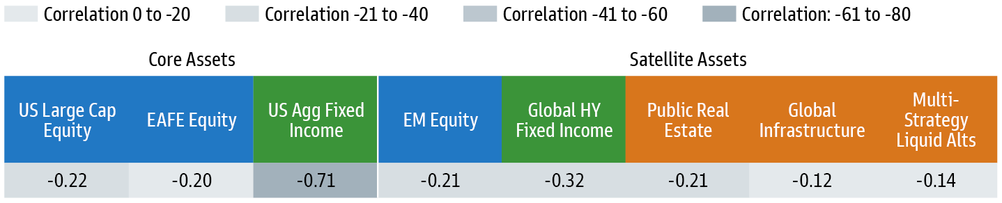 Source: MSCI, Morningstar Direct, and Goldman Sachs Asset Management as of December 31, 2022. “Core Assets”: US All Cap Equities, Developed Int’l Equities, US Aggregate. “Satellite Assets”: Broad Tactical EMD, Public Credit, Emerging Markets Equity, Global ex-US Developed Small Cap, Global Public Real Estate, Global Infrastructure, US Municipal High Yield. Correlation: a statistical measure of the strength of a linear relationship between two variables. Past correlations are not indicative of future correlations, which may vary. Proxy Benchmarks for Asset Classes: US Large Cap Equity=S&P 500 TR USD. US AGG Fixed Income=Bloomberg US Agg Bond TR USD. EAFE Equity=MSCI EAFE GR USD. EM Equity=MSCI EM GR USD. Global HY Fixed Income=Bloomberg Global High Yield TR USD. Public Real Estate=FTSE Nareit Composite TR. Global Infrastructure=S&P Global Infrastructure TR USD. Multi-Strategy Liquid Alts=Wilshire Liquid Alternative TR USD. Past performance does not predict future returns and does not guarantee future results, which may vary. Diversification does not protect an investor from market risk and does not ensure a profit.