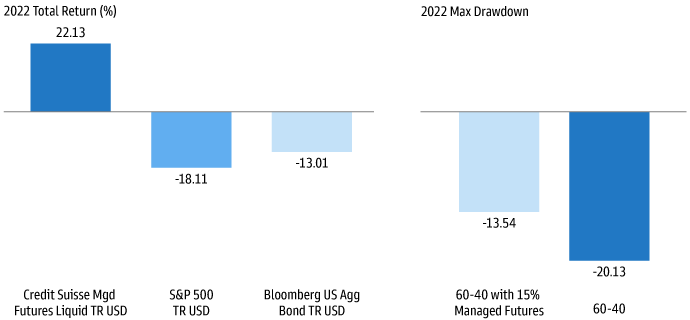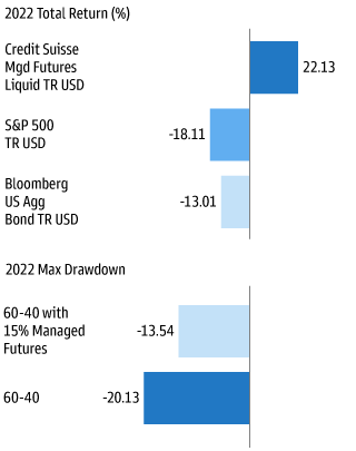 One objective for any Managed Futures strategy may be to seek to blunt risk in extreme adverse markets, when short positions may enable the strategy to profit from declines (see graphic below, left). A 15% allocation to Credit Suisse Mgd Futures TR Index in a Classic 60-40 portfolio may have blunted the Maximum Drawdown experienced in YTD 2022 (see graphic below, right).
