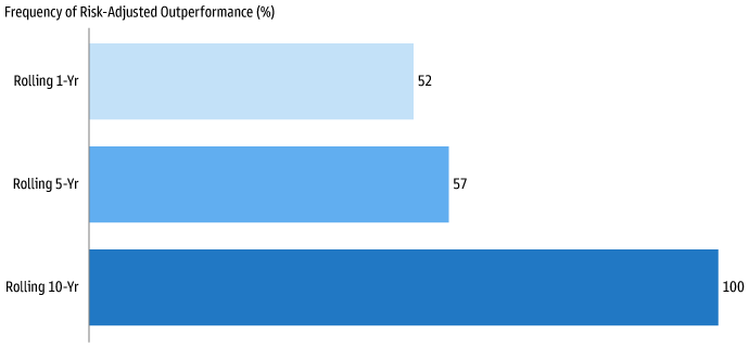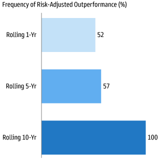 Source: Morningstar Direct, as of November 30, 2022. “60-40 with 15% Managed Futures”= 50% S&P 500 TR USD Index + 35% Bloomberg US Aggregate Bond TR USD Index + 15% Credit Suisse Mgd Futures Liquid TR USD. “60-40” = 60% S&P 500 TR USD Index + 40% Bloomberg US Aggregate Bond TR USD Index. Graph represent frequency of risk-adjusted outperformance of a 60-40 with 15% Managed Future relative to a Classic 60-40. Past performance does not predict future returns and does not guarantee future results, which may vary. The above illustration does not reflect performance of any Goldman Sachs Asset Management product and is being shown for educational and informational purposes only.