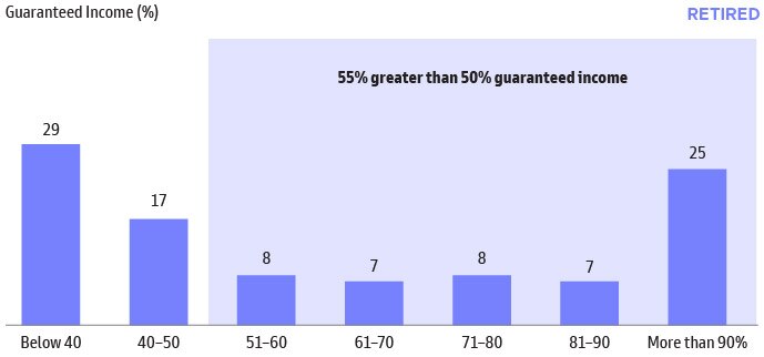 A common question for retirees is how much guaranteed income should they have. On one hand, guaranteed income can simplify a retirement income strategy with less ongoing management. However, less guaranteed retirement income (and more in accumulated savings) can offer greater flexibility but require ongoing management. For our retired respondents, we see two polarizing and divergent groups: (i) below 40% guaranteed income and (ii) more than 90% guaranteed income.
