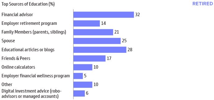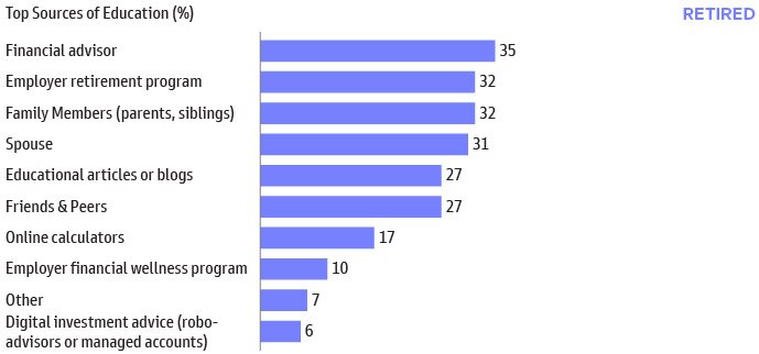 As retirement plan sponsors consider how to enhance their programs to incorporate retirement income features, it is important to acknowledge that while working respondents look to employer programs for education and advice, it is not the same for retirees. The employer retirement plan ranks sixth as a resource for education/advice in retirement, and the financial advisor is the top source instead.