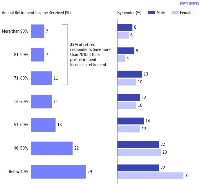 Women respondents report facing an even greater challenge accumulating sufficient saving, with 80% receiving less than 70% pre-retirement income and, notably, 35% receiving less than 40% of pre-retirement income.