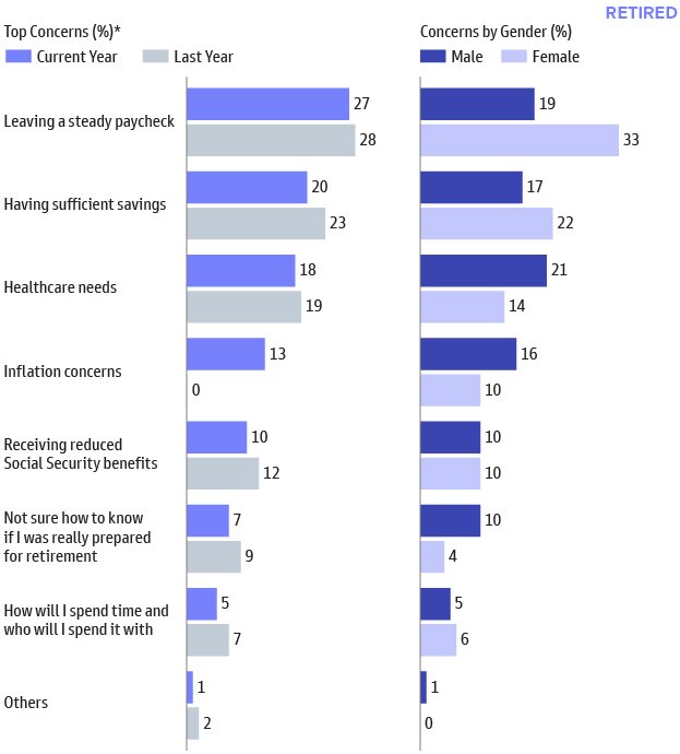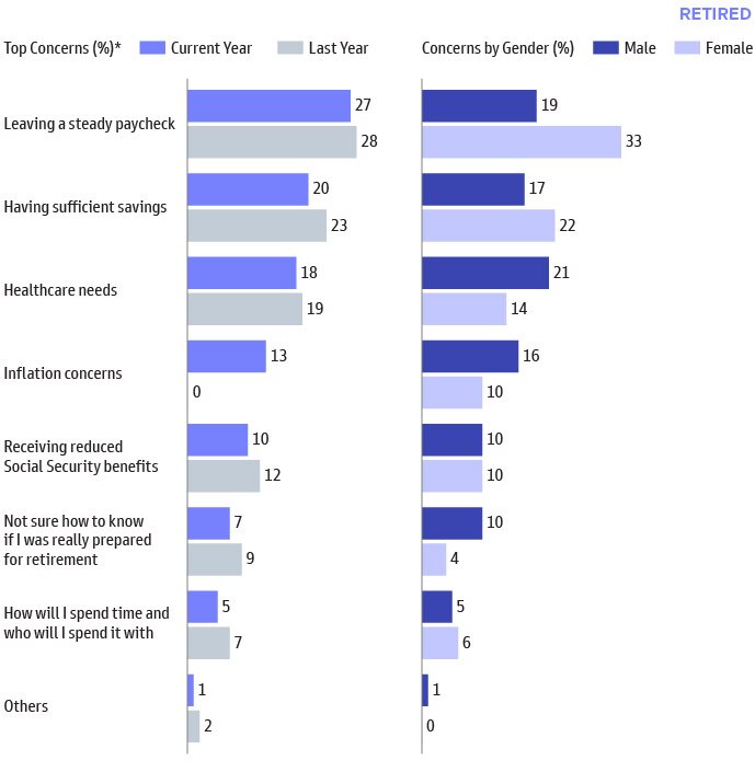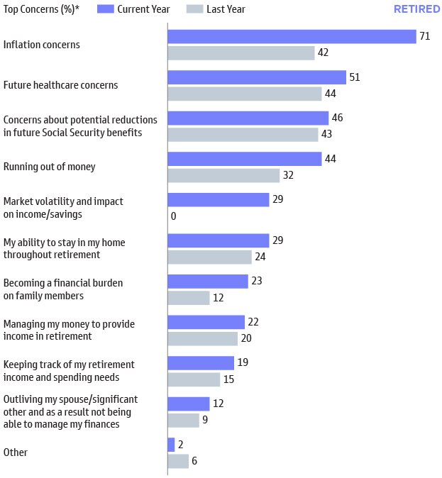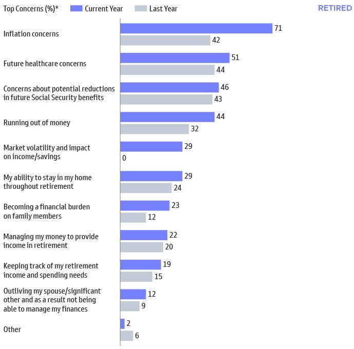 While the level of concerns have increased across the board relative to last year, inflation rose to the top spot in this year’s report for retired respondents.