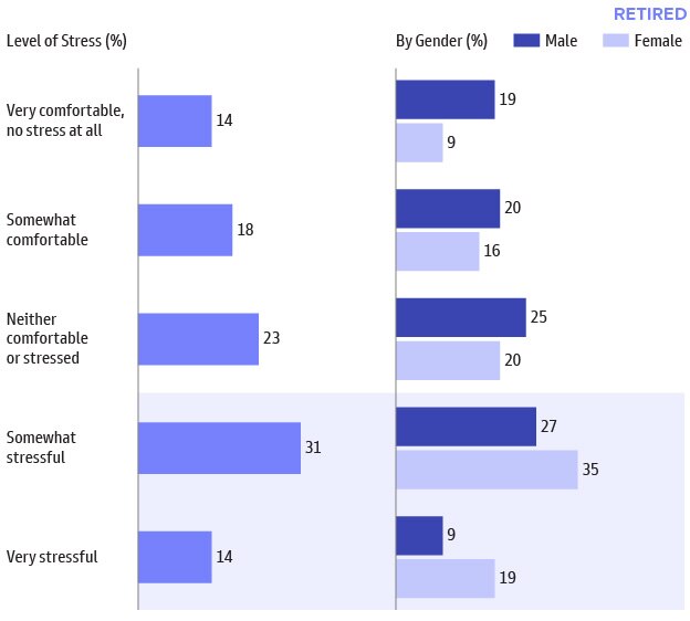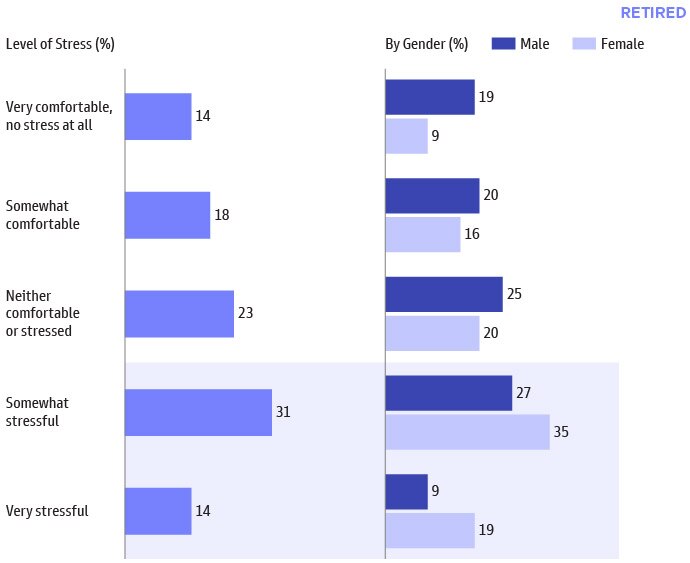 Women respondents report higher levels of stress than men entering retirement. Later in the report we highlight women respondents’ preference to generate retirement income from part-time work, which can alleviate the stress felt during the transition phase.