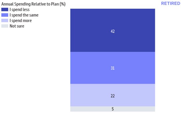 About four in ten retirees spend less than anticipated or planned, which illustrates that retirees may not have the retirement they had expected. Only 22% spend more than anticipated, which may be impacted by the current inflationary environment and rising costs.
