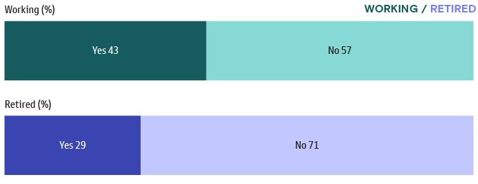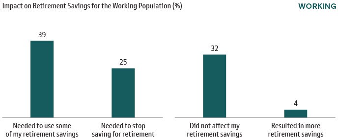 According to the survey’s findings, 43% of working respondents have reported needing to take time away from work (up from 29% for retired respondents). As a result, in the bottom chart, 64% have reported needing to either stop saving or access their retirement savings during this period.