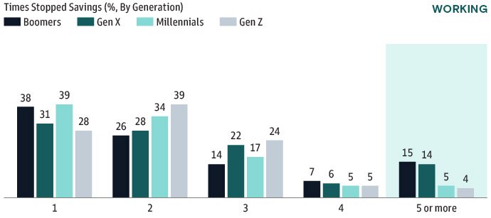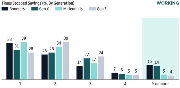 While the majority of those impacted stopped saving once or twice in their career, we also see a generational divide when comparing the younger generations to Boomers and Gen X, both of which are further along in their career are more likely to report having stopped savings five or
