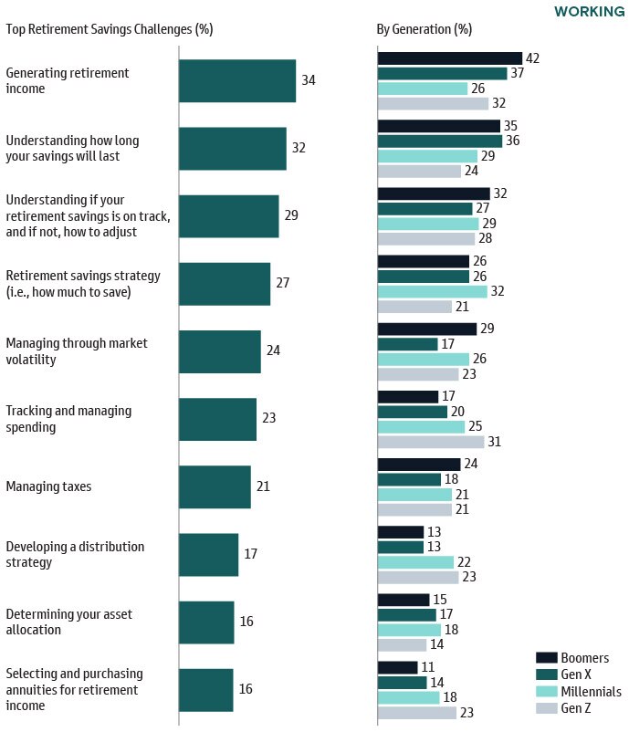 For Gen Z, generating retirement income (32%) and tracking and managing spending (31%) were top challenges.