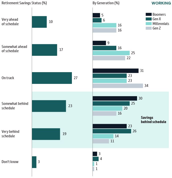 About four in ten working respondents feel their savings are behind schedule. Boomers and Gen X are the furthest behind and Millennials and Gen Z are most likely to report their savings are ahead of schedule.
