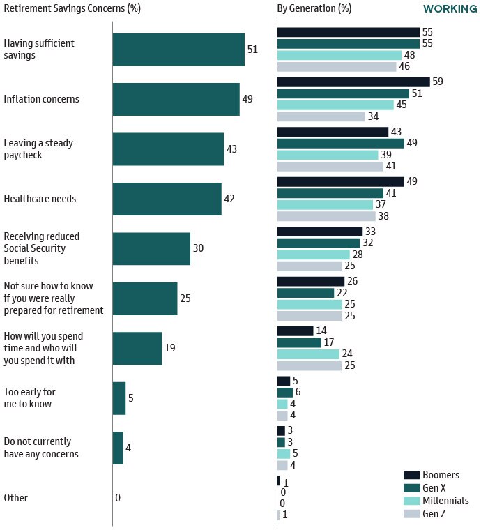The top retirement concern for working respondents is having sufficient savings. Inflation is another factor that can drag savings behind over the course of one’s career. Rounding out the top three concerns is leaving behind a steady paycheck as people transition to retirement.