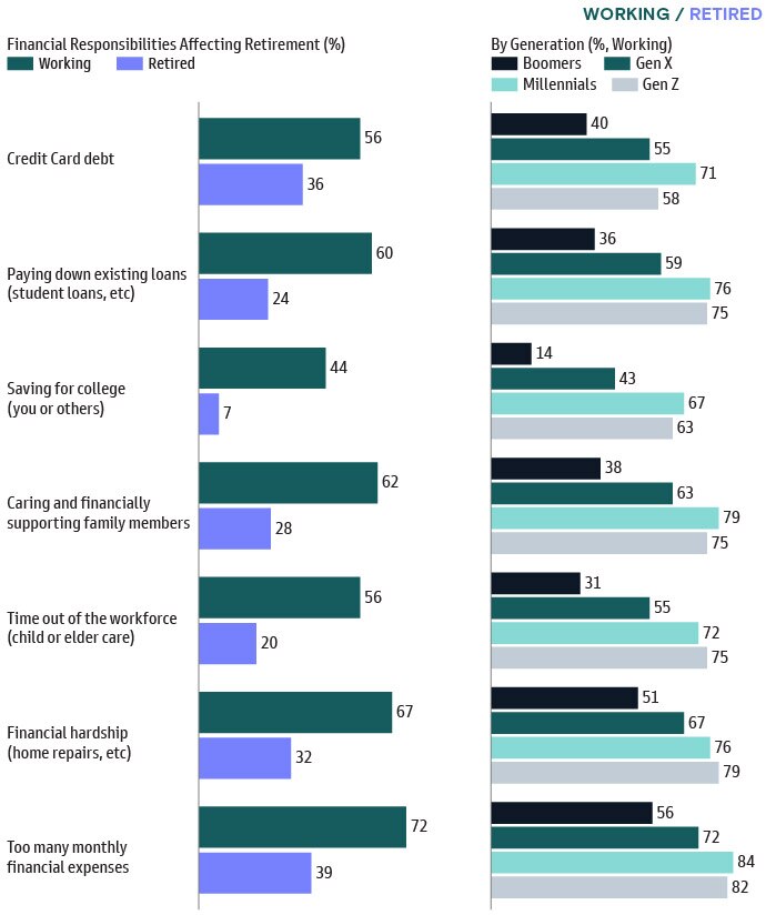Competing financial priorities can significantly impact workers’ ability to save for retirement. Comparing working respondents to retired respondents, we can see how significantly saving for retirement has changed. Balancing these competing financial needs and evaluating the trade-offs is a key concern for savers.