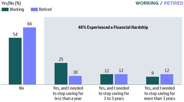 Financial hardship is a growing trend with 46% of working respondents facing some type of challenge that causes them to stop saving for retirement.
