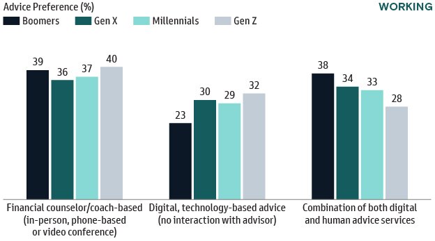 Working respondents are roughly split between how to receive financial advice: human-based advice, digital advice or a combination of both. As needs and preferences differ among individuals, offering a multi-channel sources of education can better align to how people seek their advice.