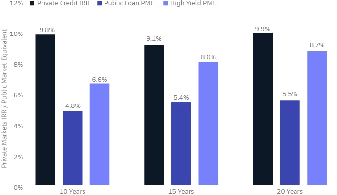1. Cambridge Associates, as of December 31, 2021. Private credit returns expressed net of fees. Past performance does not guarantee future results, which may vary. Outperformance of public loans on a public market equivalent (PME) basis. PME returns reflect the performance of the S&P LSTA Leveraged Loan index (“index”) (for public loans) and the Bloomberg Global High Yield index (for High Yield) expressed in terms of an internal rate of return and takes into account the timings of the private credit strategy’s cash flows. PME returns do not represent the actual performance of the index. Indices are unmanaged and investors cannot invest in indices. The index returns are gross total return, with dividends reinvested and do not reflect the deduction of any fees or expenses, which would reduce returns. For educational purposes only and should not be construed as investment advice or an offer or solicitation to buy or sell securities.