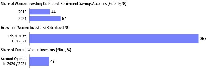 The number of women investors has surged. Over the past two years, women have become more engaged in their finances, motivated by the build-up of excess wealth following significant pandemic fiscal transfers, the shift to hybrid work that has freed up time to invest, and the need to grow earnings as economic conditions became ambiguous. As a result, financial platforms with low barriers to investing saw the fastest rise in new account openings at the turn of this decade. We think this momentum will continue, further pushing the envelope on the composition of investors towards a younger, more diverse, and more female audience.