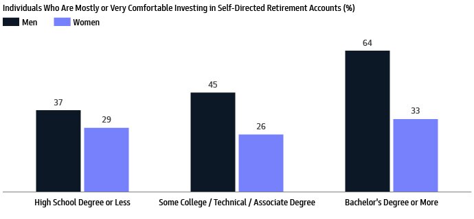 While there is a growing need and appetite for financial advice, women today remain financially underserved. A 2022 survey by Ellevest found that nearly 70% of US women have never met with a financial advisor compared to 41% of men.11 Moreover, women have routinely relied on the guidance of family members for financial advice. The share of older women with personal retirement savings has also lagged their male peers by ~3.5 percentage points and the gap grows based on marital status.12 Even across non-retirees with retirement savings, a higher share of men reported being comfortable managing their own investments relative to women.