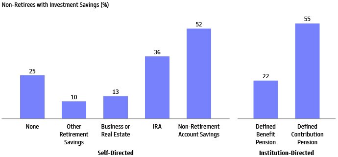 On contributions, we think the way in which Americans engage the US labor force may also play a large part in impacting wealth outcomes today. Americans have moved from a traditional employment structure (one worker to one employer) to a “one worker to many employers” structure, ultimately driving the shift in responsibility of financial well-being from employers to employees. Accordingly, this structural shift has led Americans to explore a broader range of retirement savings accounts as evident by a growing footprint of assets held in personal accounts (52%) and IRAs (55%).14
