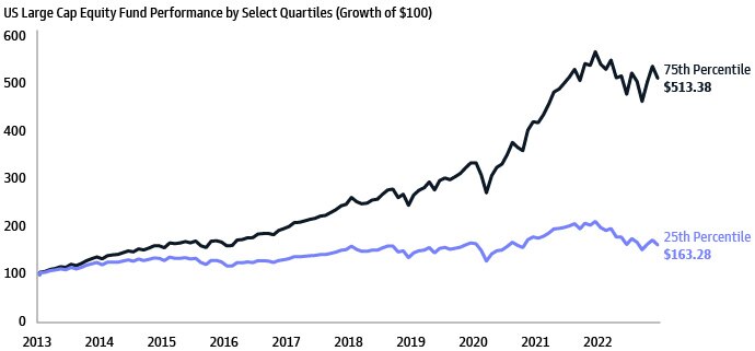 Source: Morningstar and Goldman Sachs Asset Management. Data uses returns of US equity funds that are categorized as US Large Cap Blend. Data reflects net monthly returns from January 2013 to December 2022. GROWTH OF $100: A graphical measurement of a portfolio's return that simulates the performance of an initial investment of $100 over the given time period.