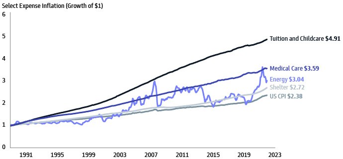 Elevated Inflation: The costs of many necessary expenses have outpaced the long-run trend of US CPI inflation, as shown in exhibit 2. We expect price pressures to persist at least through 2024 before normalizing to a historical trend level. In the meantime, these expenses may weigh on purchasing power and leave investors with less discretionary income to grow their savings.
