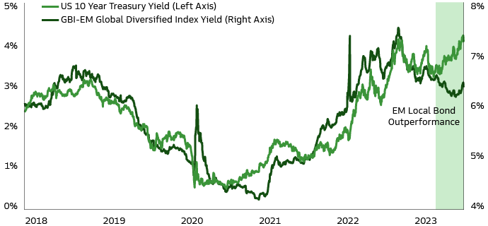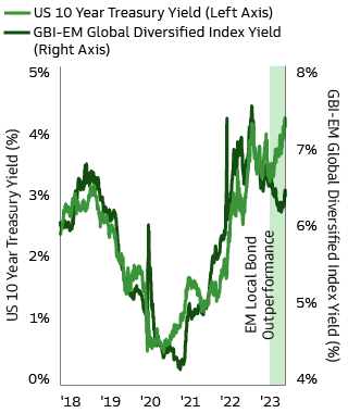 Assertive measures to counter inflation in recent years have resulted in high real rates and put EM central banks in a position to ease monetary policy ahead of DM central banks. EM local bonds, as measured by the J.P. Morgan Government Bond Index Emerging Markets (GBI-EM), have already rebounded sharply in anticipation of impending monetary easing, delivering a total return of 10% since their October lows and 7.5% year-to-date.2 Their performance has been in stark contrast with US rates, which have been volatile in 2023 (Exhibit 3).