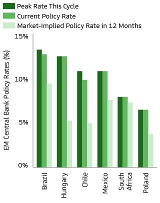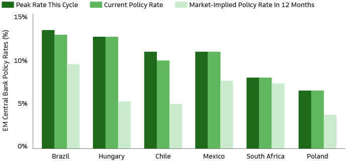 In summary, we believe the combination of high starting real rates—following historic tightening in 2021 and 2022—and accelerating disinflation portends an expansion in market-implied pricing for policy easing within select EM local bond markets in the coming months. Additionally, despite EM central banks embarking on rate-cutting cycles, we believe EM local bonds are likely to continue providing attractive yields over core DM bonds.