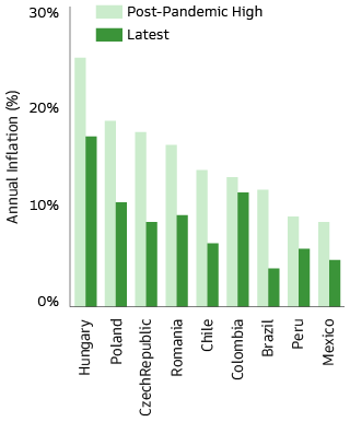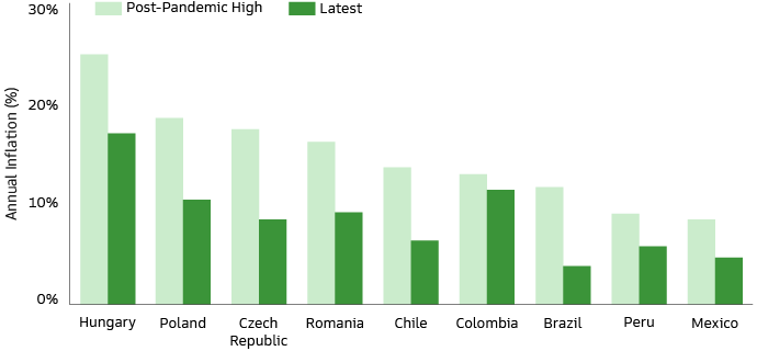 Inflation is falling rapidly across the emerging world in response to proactive monetary tightening by EM central banks, lower commodity prices compared to last year, supply chain improvements and stronger currencies (Exhibit 1).