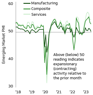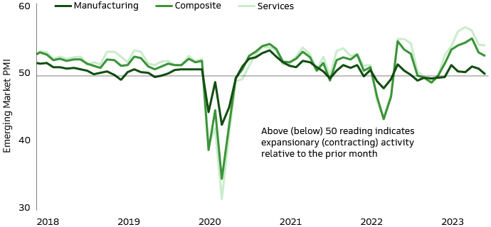 Inflation in emerging economies has fallen more quickly than in developed markets (DM), with central banks in the latter having to address larger domestically generated inflationary pressures. Although there has been some recent volatility in the commodity markets, we believe a significant degree of disinflation is still in the pipeline for the second half of 2023, particularly as growth momentum is slowing (Exhibit 2).