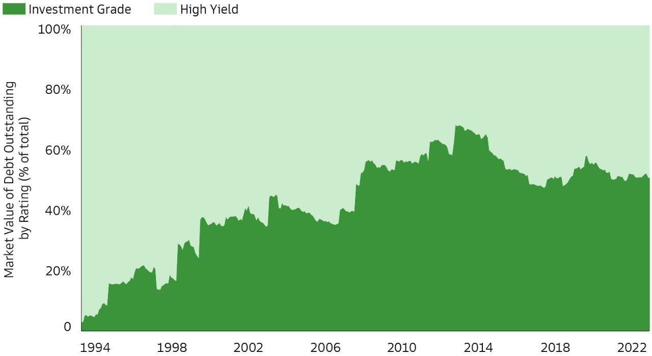 Public debt in emerging markets (EM) has surged to levels unseen since the 1980s, driven by lower borrowing costs (in the decade preceding the recent global monetary tightening cycle) and debt-driven growth in response to China’s economic deceleration.2 But unlike the 1980s, many larger EM sovereigns have lower external debt, while local currency debt markets have deepened, and average quality of an issuer in the J.P. Morgan Globally Diversified Emerging Market Bond Index (EMBI) index has improved (Exhibit 1).