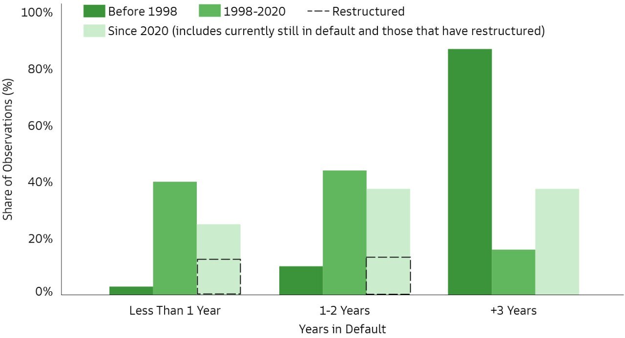 Source: Cruces and Trebesch (2014), Asonuma and Trebesch (2020), Goldman Sachs Global Investment Research as of June 21, 2023. Includes data on countries that are still in default and have not restructured debt. The period 1970-1998 features numerous countries defaulting several times on the same debt; time spent in default is adjusted to be the first and last debt restructuring which was followed by regained market access. Goldman Sachs Asset Management leverages the resources of Goldman Sachs & Co. LLC subject to legal, internal, and regulatory restrictions.