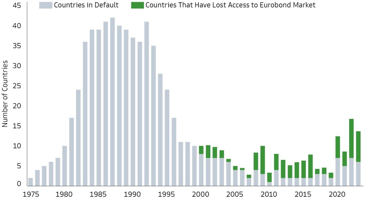 2. The Vulnerable: A cohort of HY-rated sovereigns face impaired or no market access, require support from international Financial Institutions (IFIs), and demonstrate macro vulnerabilities due to high current account deficits and low currency reserves. Notably, the combination of higher debt, higher rates, and external vulnerabilities has pushed the number of EM sovereigns in distress to the highest level since the late 1970s (Exhibit 3).