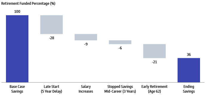 Late Start: Student loans, rent, saving for a first home, etc. are all reasons that can prevent an individual from saving for retirement early in their career. Because of the value of compounding, the early years are critically important to the overall savings accumulated.