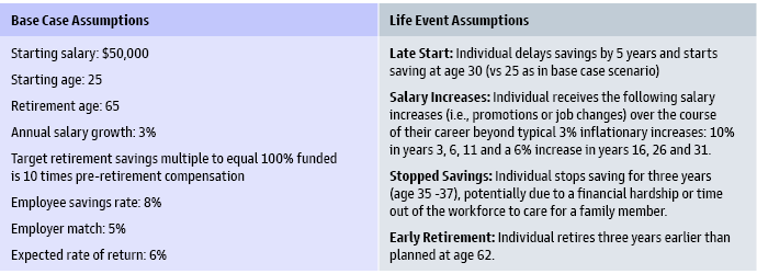 We analyzed the impact that common life events can have on an individual’s retirement savings. The starting point for our analysis is the “textbook” retirement saver, who saves and invests consistently over their career beginning at age 25. Their starting salary is $50,000 and increases 3% annually (assumed inflation) over the course of their career, which is used to determine their projected retirement saving goal. We assume savings should equal approximately ten times their final pre-retirement compensation (at age 65) as a “fully funded” proxy (as ten times pre-retirement compensation is a general rule of thumb to have sufficient savings entering retirement and generally requires that an individual save approximately 10% – 15% (individual savings + employer match) over their career and invest in a diversified portfolio). We then evaluate common career and life events to understand how they can impact the goal of having sufficient retirement savings.