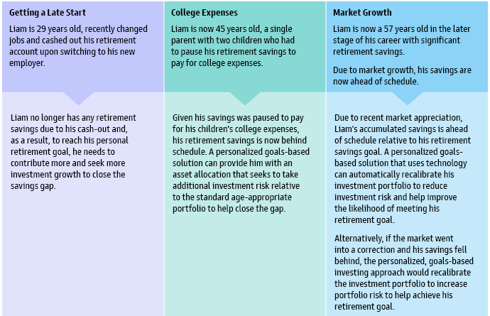 As with most things in life, circumstances change, especially over the course of a career. As individual circumstances change, another benefit of a technology-based solution is that it can recalibrate the individual’s retirement asset allocation and contribution strategy to dynamically account for these changes and keep the strategy aligned towards the individual retirement goal. It could be a life event or market event that alters the situation, but given the importance of investment compounding to retirement savings, leveraging technology to timely recalibrate can help avoid delays and maximize the amount of time the adjustments can work towards closing any retirement savings gap or reducing investment risk to keep existing savings.