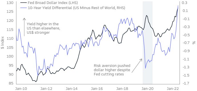 Source: Macrobond, Federal Reserve Bank of St. Louis, and Goldman Sachs Asset Management. As of November 6, 2022. Latest is October 2022. Interest rate differential calculated using the historical weights of Nominal Advanced Foreign Economies U.S. Dollar Index published here. Past performance does not guarantee future results, which may vary.