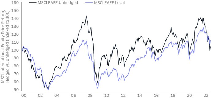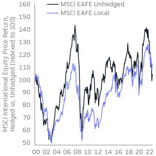 Source: Bloomberg, Goldman Sachs Asset Management. As of October 31, 2022. Chart shows MSCI EAFE absolute, monthly returns in USD to simulate an unhedged currency portfolio, and MSCI EAFE absolute, monthly returns in local currencies to simulate a hedged currency portfolio. Past performance does not guarantee future results, which may vary.