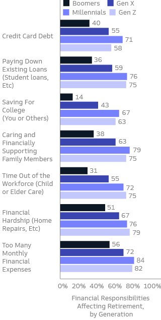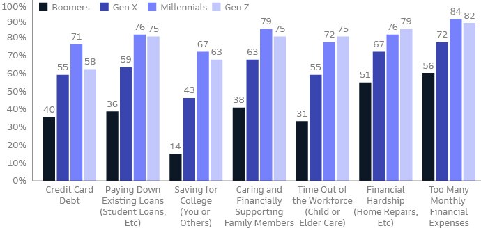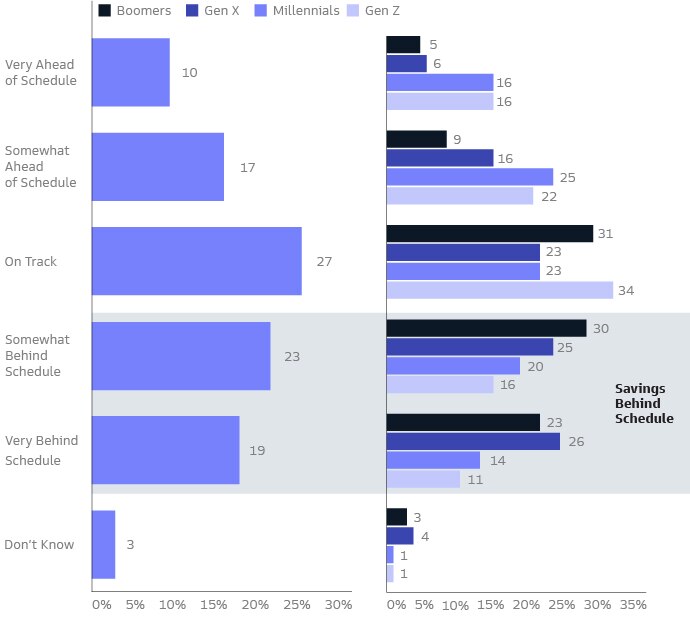 Our report further shows how retirement savings for workers and retirees may be impacted differently by the financial vortex. Only 25% of retirees in our survey reached retirement with 70% of their pre-retirement income, and more than half have less than 50% of their pre-retirement income. Many workers nearing retirement are on a similar path, where about four in ten working respondents feel their savings are behind schedule. Here we also see a disparity across generations, with Boomers and Generation X feeling the furthest behind and Millennials and Gen Z most likely to report that their savings are ahead of schedule. Additionally, 65% of Gen X respondents are stressed about managing their retirement savings as they face a tumultuous macroeconomic backdrop with time to close the savings gap narrowing. The generational difference highlights that as one progresses through different stages of life and career, it may be difficult to keep retirement savings on track.