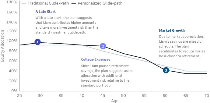 Liam’s retirement savings fall behind schedule because of a pause due to life events. A personalized goals-based solution can provide him with an asset allocation that seeks to take additional investment risk relative to the standard age-appropriate portfolio to help close the gap.