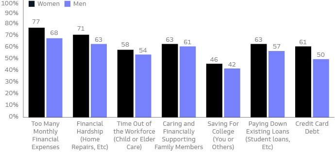 Additional headwinds face women saving and preparing for retirement. On average, women earn 21% less lifetime income than men, and have an average of nine years less earned income, often due to caregiving which takes them out of the workforce and affects their Social Security benefit amounts.1 They also have to prepare for nearly three years longer life expectancy than men, on average.2 These factors put more pressure on their retirement finances, and we see from the survey that women report being impacted by more financial factors than men. To that end, it may not be surprising that four in five women respondents reported receiving less than the target 70% pre-retirement income in retirement, and women reported more stress (61% vs 52% for men) and less confidence in their ability to manage their retirement savings (47% vs 68% for men).