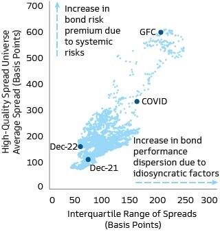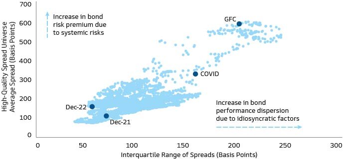 Instead, a market environment of increased idiosyncratic risk and a higher corresponding dispersion of returns seems likely to persist. The chart showing the High-Quality Spread Universe illustrates how this applies to high-quality fixed income spread sectors including investment grade corporate credit and AAA-rated securitized sectors. As illustrated by the bottom left corner of the chart, ample liquidity and record low interest rates in the last cycle lifted all assets with limited performance dispersion. For instance, corporate bonds in a given sector generally performed in line with each other despite differences in balance sheet positions. We expect that to change in a higher-for-longer rate and inflation environment, and that will provide opportunities to generate alpha through active security selection. An investor with detailed knowledge of a company’s ability to afford higher borrowing costs will be more valuable in today’s environment to add alpha—and avoid losses—than in the post-GFC era when low rates obscured the differences in corporate finances.