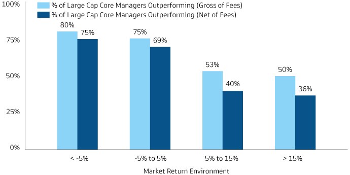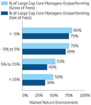 In today’s markets, characterized by higher interest rates and elevated volatility, we believe investors will likely have to be more selective. Profitability and indebtedness will matter more, and tighter financial conditions, increased economic and geopolitical uncertainty and increased return dispersion may offer greater opportunities for managers to generate alpha. We began to see this outperformance in 2022, when 57% of active US large-cap core equity managers outpaced their benchmarks, the highest percentage in over a decade.2 Over a longer period, data suggests more challenging markets characterized by lower total returns tend to correlate with better relative returns for active managers.