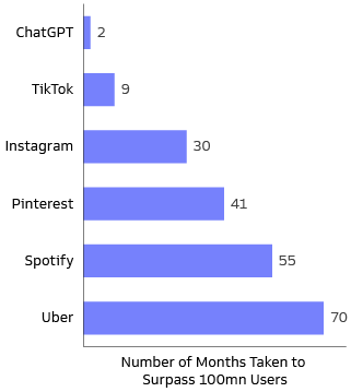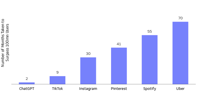 Source: Goldman Sachs Global Investment Research and Goldman Sachs Asset Management. As of June 30, 2023. Chart shows the number of months that each software took to surpass 100 million users. This material is provided for educational purposes only and should not be construed as investment advice or an offer or solicitation to buy or sell securities. Any reference to a specific company or security does not constitute a recommendation to buy, sell, hold, or directly invest in the company or its securities. For illustrative purposes only.