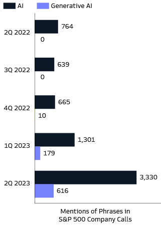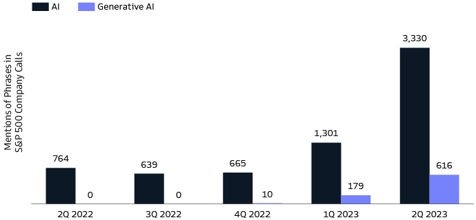 Source: Bloomberg and Goldman Sachs Asset Management. As of June 30, 2023. Chart shows number of mentions of “AI” and “Generative AI” in company calls by quarter. This material is provided for educational purposes only and should not be construed as investment advice or an offer or solicitation to buy or sell securities. For illustrative purposes only.