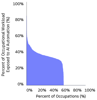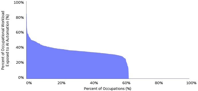 Source: US Department of Labor’s Occupational Information Network (O*NET), Goldman Sachs Global Investment Research, and Goldman Sachs Asset Management. As of May 30, 2023. Chart shows the occupation-level distribution of the share of tasks that AI can perform, with occupations and tasks based on the US Department of Labor’s Occupational Information Network.