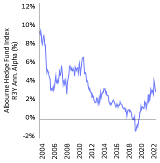 Finally, the new macroeconomic regime has been a significant tailwind in the trading environment for tactical trading managers. Trend following and directional macro managers benefited from the coordinated rise in interest rates during 2022 to post one of their strongest return years on record due to the performance of the fixed income portions of their portfolios (for reference, for calendar year 2022, HFRI Macro Index returned 8.8% and SG CTA Index returned 20.15% vs MSCI World -18.5% and Barclays Agg -13%).9 Fixed income relative value managers were able to profit not just from the higher level of interest rates, but also from the increased volatility in fixed income markets allowing them to meet their return objectives at lower levels of leverage and risk. We expect the environment to remain attractive for tactical trading funds in the medium term, particularly for global macro managers who may be able to profit from divergence in the monetary and fiscal policies of both developed and emerging economies as inflation normalizes in certain countries while remaining high and problematic in others.